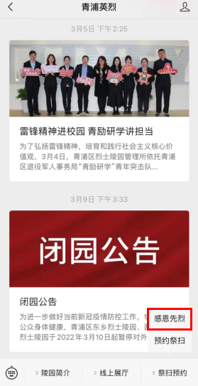 进入微信公众号“青浦英烈”,点击“祭扫预约”-“感恩先烈”,即可向烈士敬献鲜花。