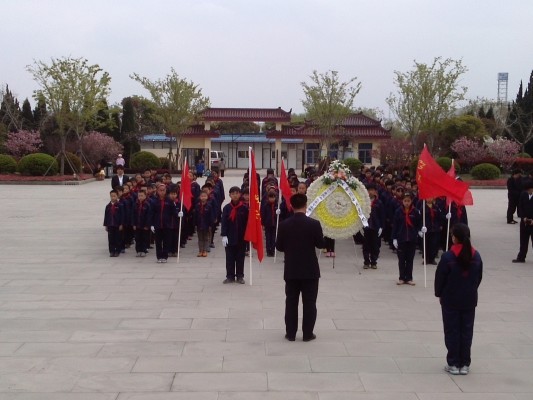 学生们神情肃穆地在纪念广场上排好队伍,在革命烈士纪念碑下,校长通过讲述革命先烈们英勇无畏、不怕牺牲的精神,说出对他们的期望:希望他们继承先烈们的遗志,将烈士精神发扬光大,为建设美好中国努力学习、努力奋斗。伴随着庄严的乐曲声,两位学生代